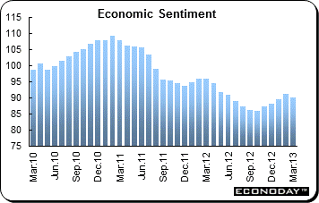 March economic sentiment declined to 90 from 91.1 in the previous month. The decline was driven by decreases in all business sectors, while consumer confidence remained broadly stable. Industrial confidence declined by 1.2 points to minus 12.5, due to a much more negative assessment of the current level of overall order books and a slightly weaker view of stocks of finished products. Services confidence halted its upward trend observed since October 2012. The corresponding indicator dropped to minus 6.7 from minus 5.3. Driven by a worsened assessment of all the three sub-components, confidence among retailers deteriorated to minus 17.6 from minus 16.1. Consumer confidence remained broadly stable at minus 23.5. Consumers were less pessimistic regarding their unemployment expectations but slightly more pessimistic regarding their savings expectations over the next 12 months.