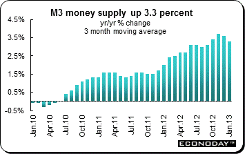 February M3 money supply was up 3.1 percent from a year ago after increasing 3.5 percent the month before. The three month moving average — the measure preferred by the ECB — slowed to 3.3 percent from 3.6 percent. The key private sector lending component posted a 12-month contraction of 0.9 percent, unchanged from January. Annual growth of household borrowing was unchanged at 0.5 percent. Within this, loans for house purchase, the most important component of household loans, stood at 1.4 percent and unchanged from the previous month. Borrowing by non-financial corporations was down 2.6 percent in February compared with a 2.5 percent decline in January. Lending to non-monetary financial intermediaries (excluding insurance corporations and pension funds) was down 0.5 percent.