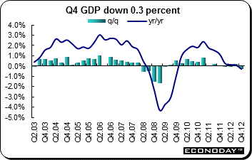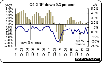 Fourth quarter gross domestic product contracted 0.3 percent on the quarter as expected. On the year, GDP also was down 0.3 percent. For the year 2012, GDP was flat after growing 1.7 percent in 2011. Households' consumption expenditure remained sluggish in the fourth quarter, down 0.1 percent. Gross fixed capital formation declined 0.8 percent after easing 0.4 percent a quarter ago. Exports were down 0.6 percent while imports dropped 1.2 percent. As a result, foreign trade balance contributed positively again to GDP growth. On the contrary, changes in inventories continued to weigh down on GDP growth in the fourth quarter.