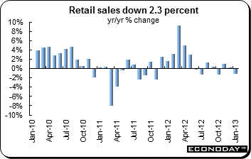 February retail sales dropped 2.3 percent from a year ago after falling 1.1 percent in January. Most major categories declined. Auto sales dropped 10.3 percent after sliding 11.0 percent the month before. Retail machinery sales declined 4.0 percent after dropping 4.4 percent. Other categories that retreated included general merchandise, fabrics, apparel & accessories and food & beverage. Fuel sales were up 1.8 percent. Analysts will be looking at household spending to see just how weak consumption is in the run-up to the Bank of Japan meeting next week amid market expectations for a hefty dose of quantitative easing.