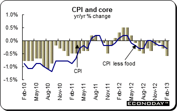 February consumer price index was down 0.1 percent on the month and 0.7 percent from a year ago. Less fresh food, the CPI was unchanged on the month and down 0.3 percent on the year. Excluding food and energy, the index was unchanged and dropped 0.9 percent. Energy costs were up 5.0 percent on the year in February after increasing 3.9 percent the month before. The core CPI excluding fresh food was down because of depressed prices of TVs and air conditioners and heaters. The Bank of Japan has promised to conduct more aggressive monetary easing under its new governor. Many in the market expect the BoJ to struggle as the government also needs to work out feasible growth strategies in order to boost inflation expectations among households and businesses.