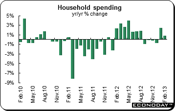 February household spending was up 0.8 percent from a year ago. Spending on transportation & communication jumped 11.4 percent while housing slumped 11.1 percent. Spending on medical care was down 8.3 percent from a year ago. Other categories that declined included fuel, light & water charges and furniture & household utensils. Spending increased for culture & recreation (up 3.5 percent), education (up 4.8 percent) and clothing & footwear (up 3.8 percent). The average of monthly consumption expenditures per household for February 2013 was ¥268,099.