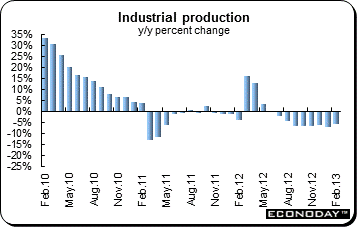 February industrial output slipped 0.1 percent on the month and was down 5.7 percent on the year. This was the first monthly decline in three months. Output was hit by a downturn in production of electronics devices, such as memory chips used for smartphones, reflecting slower demand in Asia. But the report showed an upturn in the forecast for the coming two months, underscoring that the economy has already moved out of a brief slump caused by the global slowdown and aggravated by weaker demand from China when the territorial dispute over the East China Islands flared up. METI's latest survey of factory operators showed that industrial production is projected to rise 1.0 percent on the month in March and climb a further 0.6% percent in April led by a recovery in demand for electronics and general machinery.