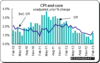 February consumer price index jumped 1.2 percent on the month and from a year ago. Core CPI excluding food and energy was up 0.9 percent and 1.1 percent while the Bank of Canada’s core which excludes eight volatile items was up 0.8 percent and 1.4 percent. Seasonally adjusted CPI was up 0.7 percent for the steepest monthly gain since June 2008. Excluding food and energy, the index was up 0.3 percent while the Bank of Canada measure was 0.4 percent higher. Within the overall adjusted basket the main area of strength was transportation which, with a 2.4 percent spurt, dominated the headline increase. Elsewhere, the cost of food climbed 0.9 percent as did clothing & footwear while alcohol & tobacco advanced 0.4 percent ahead of household operations, furnishings & equipment at 0.3 percent. In contrast, shelter charges were up just 0.1 percent.